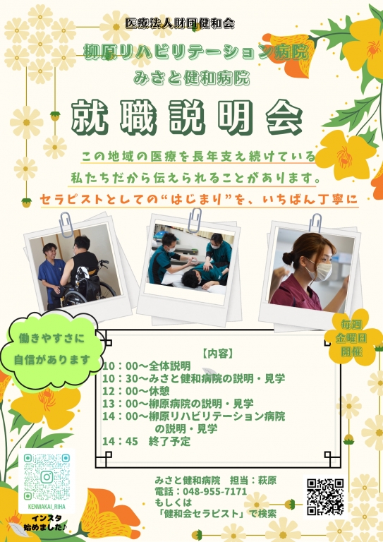 病院見学会は例年通り、3病院の見学をして頂き、広いフィールドで多種多様なリハビリテーションを提供する姿を直に見て頂く形となっております。